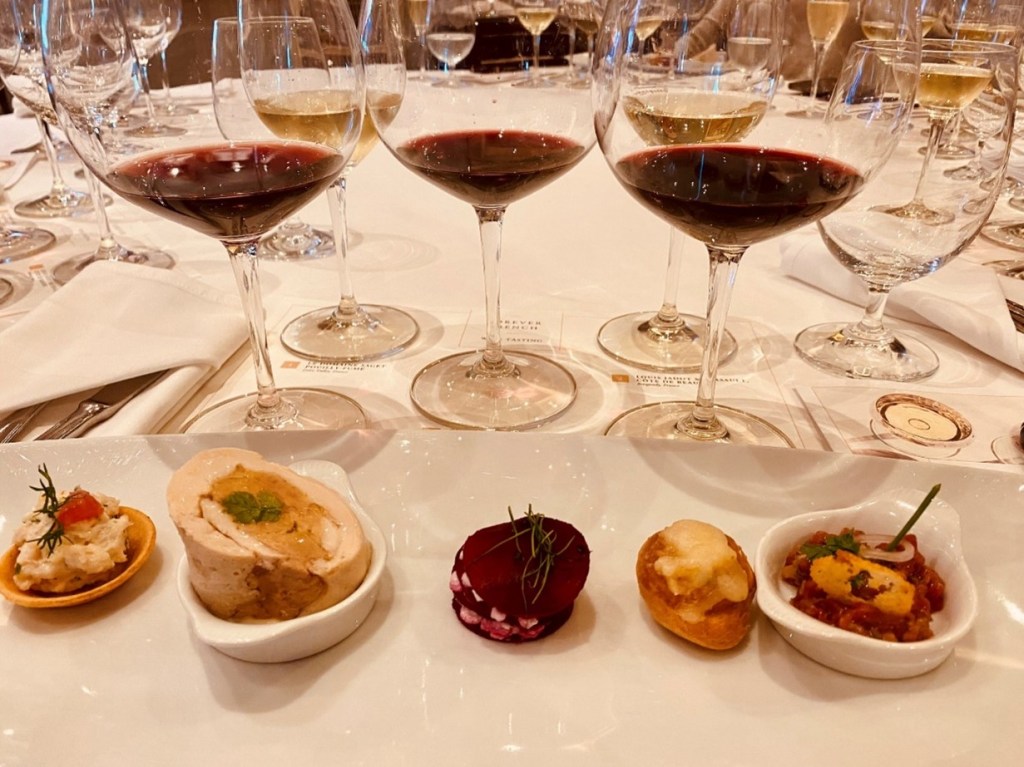 We were greeted with our next tasting, an offering from Louis Jadot Meursault, Cote De Beaune (2017) from Burgundy, France. This was basically a chardonnay. Somewhat oaky and is recommended to serve NOT chilled. I don’t know about you, but I do like my white wines chilled. Probably because I’m not a connoisseur, but I do know what I like. The backstory to this particular offering was fairly fascinating and my big take away was that Thomas Jefferson enjoyed this wine so much, that during his French ambassadorship in 1778 he bought an entire year’s crop! Either wine was cheap back then, or he was making a fair living as a politician? The wine was a little flat in my mouth and had it not been for the Chicken-Foie Gras pairing, it wouldn’t have been that remarkable. However, that Foie gras…UM! I let out an audible gasp of enjoyment, so much so, my travel mate (and new Father-in-Law to my Stepson) offered me their serving. I am sure they wanted to relive that moan of enjoyment! I can’t help it. I really enjoy a good liver. And no, they didn’t have a nice Chianti! LOL! We were told this bottle could fetch about $110. Not really my style but throw a good piece of liver in there and I might be tempted to pop for a bottle!