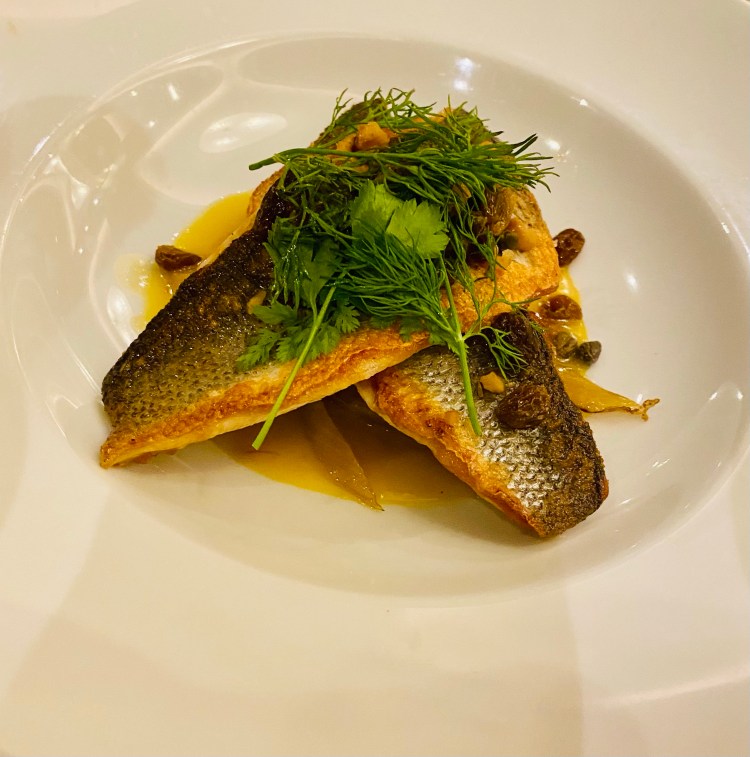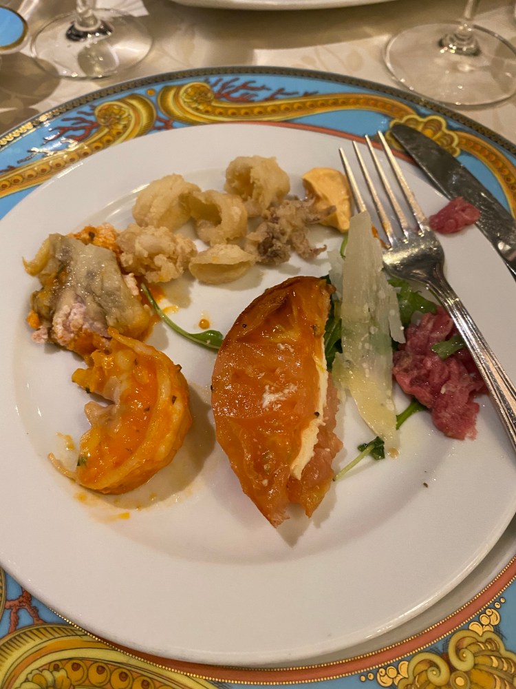 I have been dreaming about what to write regarding the experience at Toscana onboard the Cruise Ship Marina with Oceania! Apparently, Toscana is a cruiser favorite and I definitely understand why. Upon arrival, our group was promptly seated, and a cart of various olive oils was brought to the table. Growing up in San Antonio, Texas I am used to table side guacamole, or queso flameado but I wasn’t quite sure what they were going to do with olive oil. After a few minutes, the server presented several types of olive oil and told us a brief description of each one. Similar to a wine presentation, we were offered tastes. I chose one that had a peppery flavor profile. We were provided with a basket of the most amazing bread (quickly becoming a common theme on this ship!) to dip in the little plates of olive oil. It was absolutely delicious and a perfect way to perk up our taste buds.