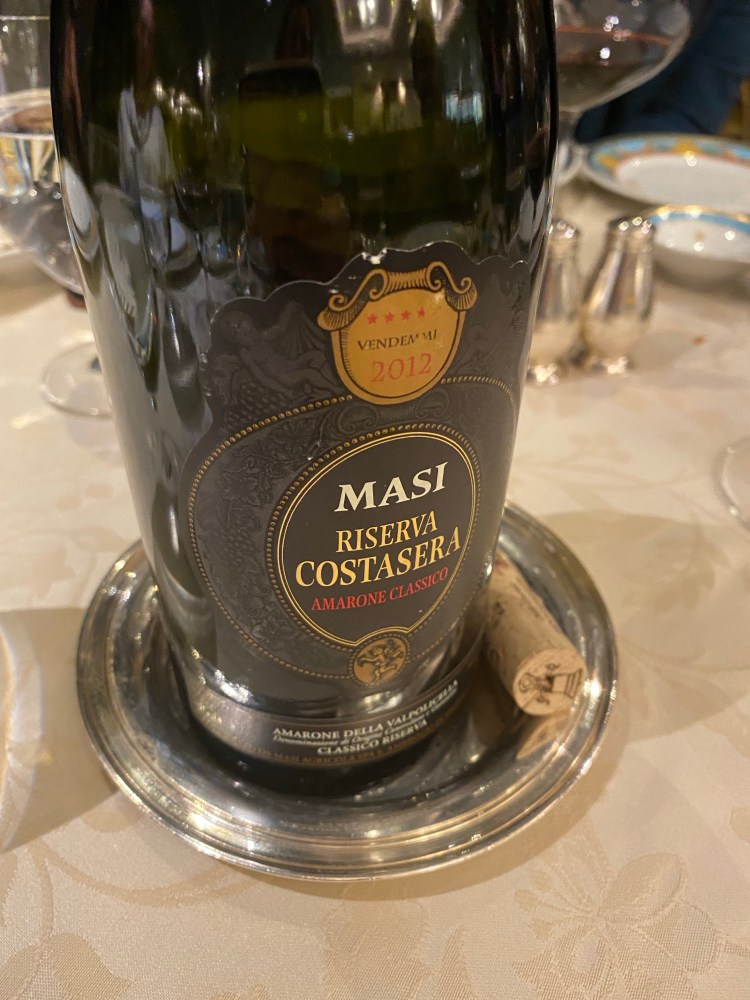 Now it was time for the main courses and the next bottle of wine, a 2012 Masi Amarone della Valpolicella Classico Riserva Costasera. Now THIS was a big, bold red. Very fine, soft on the mouth with flavors of dark fruits and a hint of herb. This one had quite a bit of tannins and was an overall favorite for the table with a nice long finish.