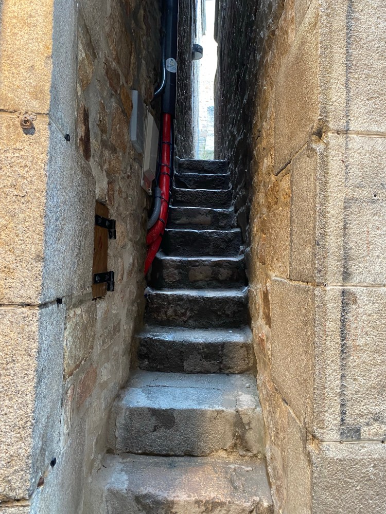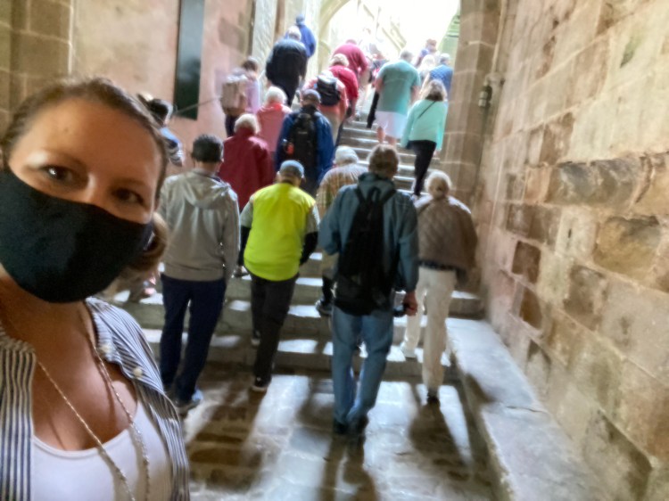 It was a little tough (okay downright difficult) to walk up the stairs here. I was shocked to see an older gentleman who could barely walk, slowly and painstakingly in what seemed like a daily pilgrimage for him, making his way up the stairs. It was very moving for us to watch him. He was hunched over and was walking up the wrong way because the tourists were pushing him out of the way and inhibiting his journey. It seemed as though the staff at the Abbey knew who he was because he was able to bypass the ticket taker and requirement for the health pass (QR code) for entry. And it was at this point, several folks from our group peeled off and decided to wait at the bottom because the walk up was way too intimidating!