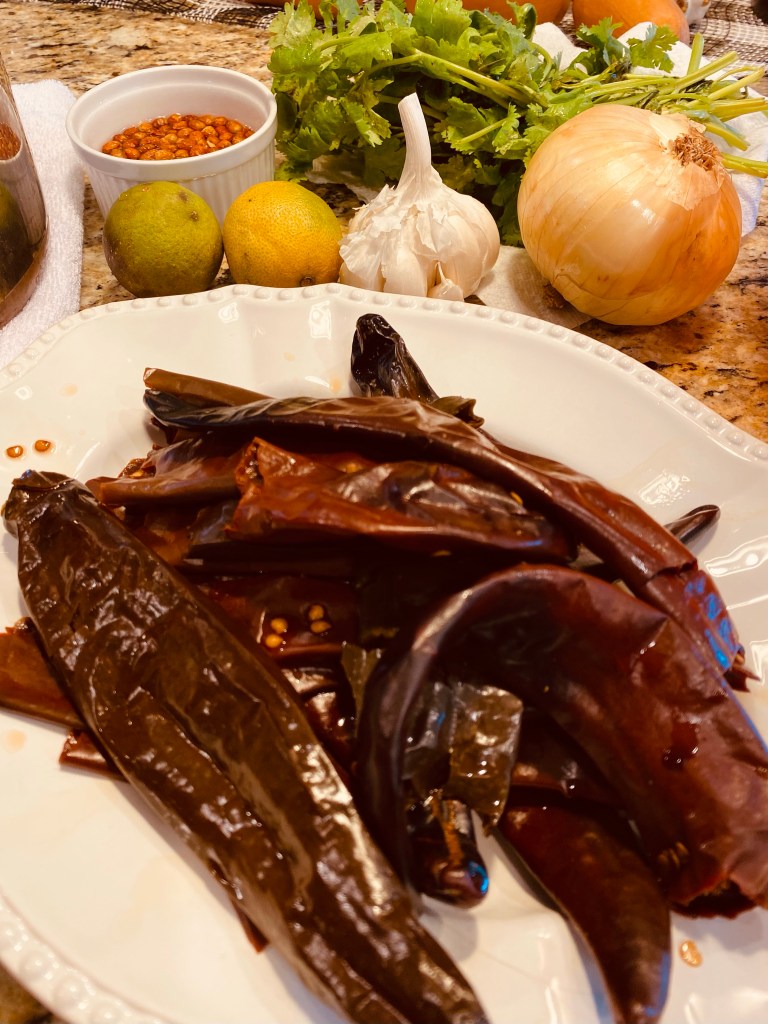 Boil a large pot of water. Remove from heat when boiling. Immediately add dried chili pods, push pods under water (they like to float), and Soak for an hour to rehydrate.
