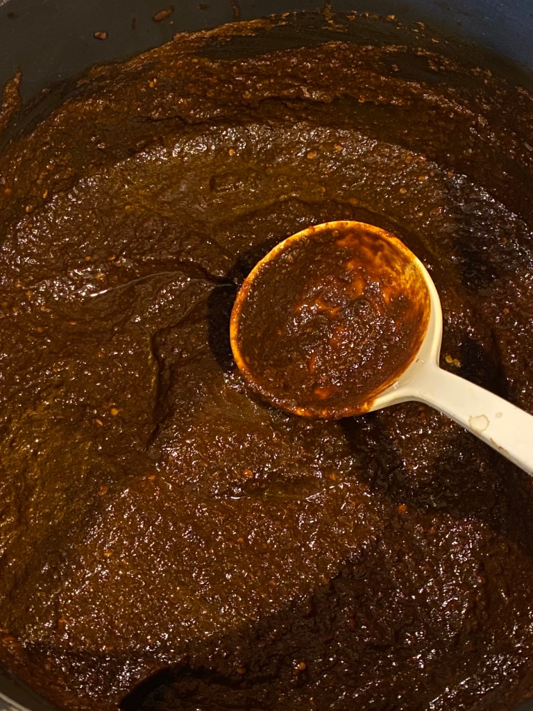 After about ten minutes of cooking the “on-gar” slurry, start to blend up the rehydrated chili. I used two blenders for this but, you can do in batches. Make sure on of the batches gets the cilantro blended in with it! You will need to add the chili water (by the ladle) in to the blender to help the chili blend. It will be thick but you want it to move around. Add enough of the chili water until you see consistent movement. *if using the chili pequin, then add these to the blender at this point! Then pour in to the pot with the on-gar sauté.