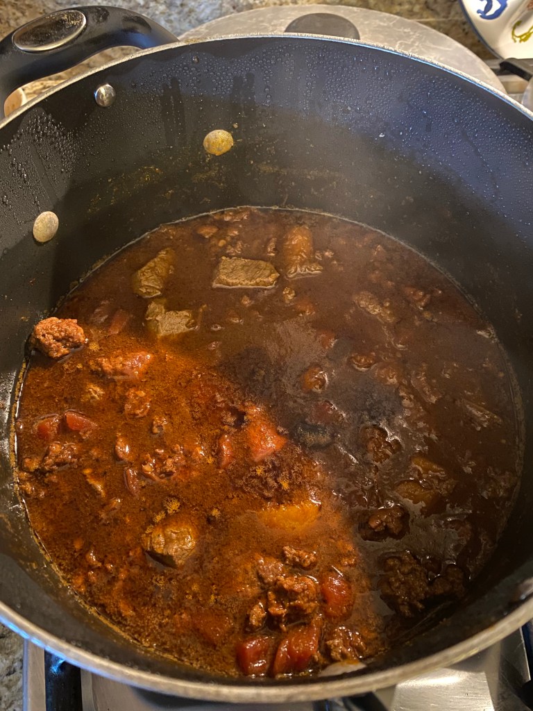 Cook til bubbles form and then switch to low for a simmer. You want this to simmer together for about an hour. But don’t let it burn. You can add additional chili water if you like more fluid.
