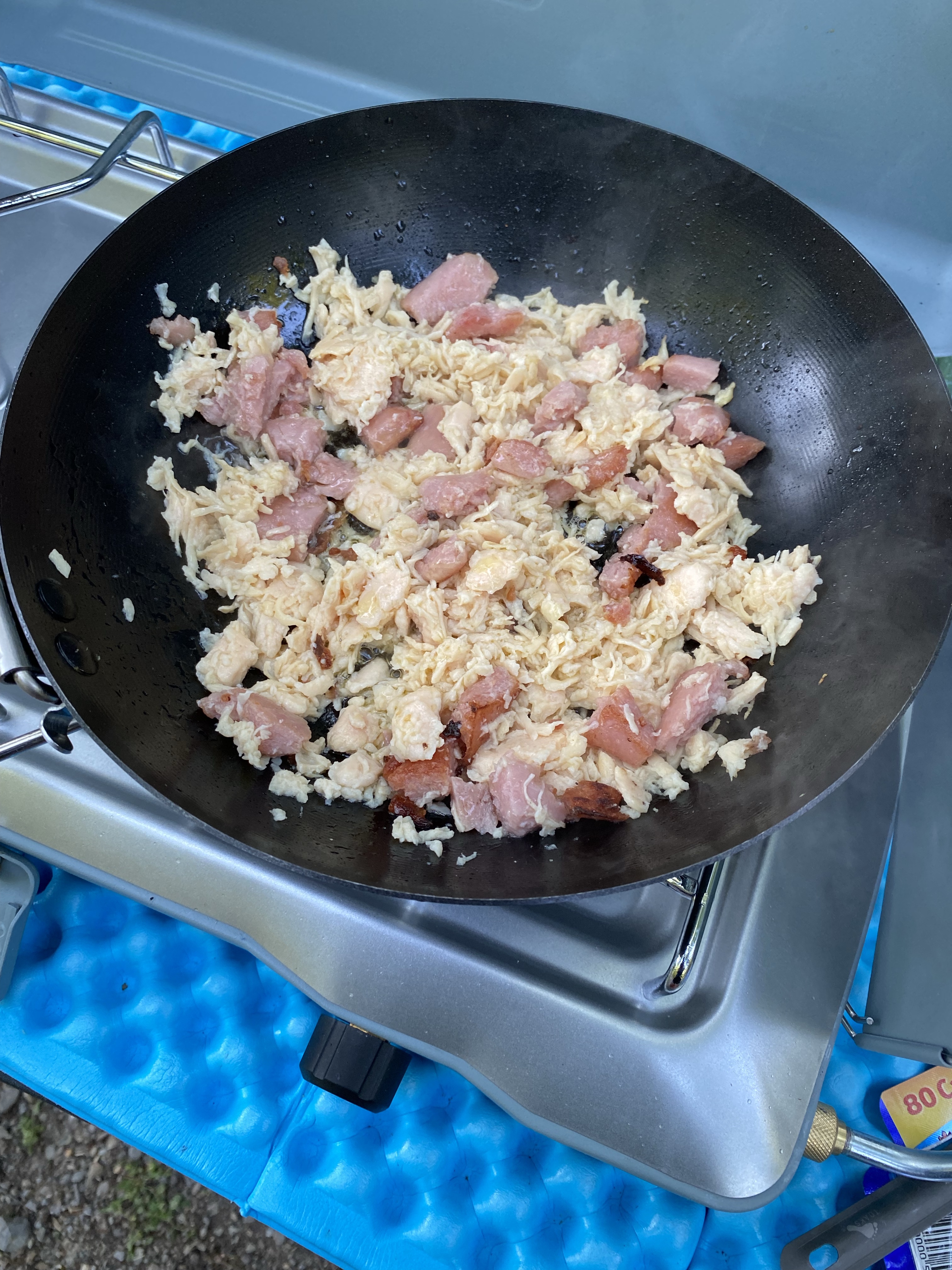 Fry up your spam first and get it nice and crispy. Think bacon here. Then throw in your chicken (tuna would probably work fine too). If you have olive oil, then by all means, use it!! Stir this for about 1-minute.