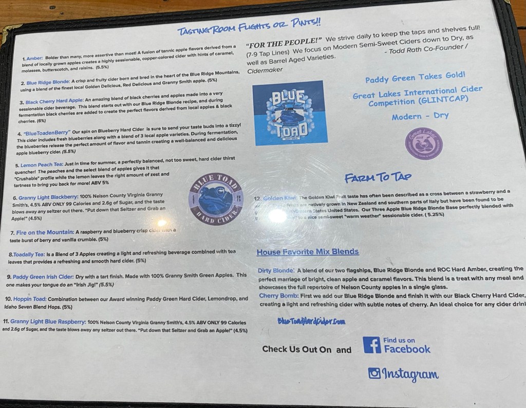 About 4-miles off trail (an easy hitch) and just east of the Appalachian Trail at Reid’s Gap is Blue Toad Cidery. Devil’s Backbone Brewery is directly across the street, but this place is a hidden gem.