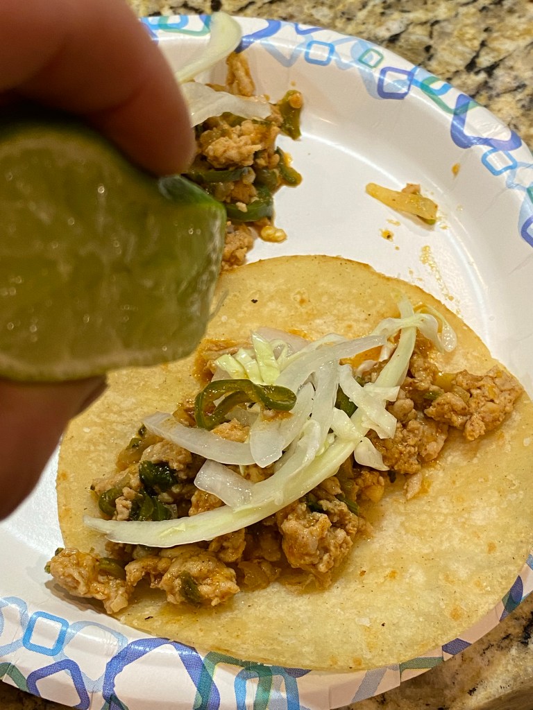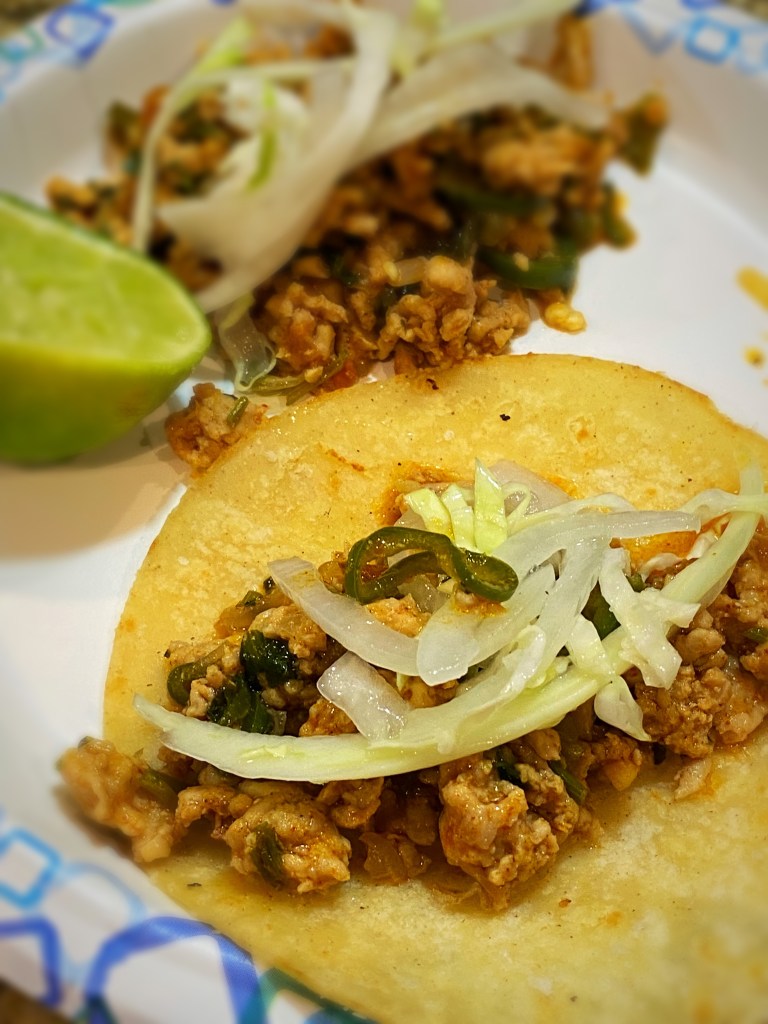 Today, after listening to my husband complain that “we have nothing…” to eat (show of hands, how many of you have this happen all the time?! 🤣), I perused the fridge and found a package of minced chicken meat and a few other random items, so i decided to throw together a kind of chicken larb with lettuce cups. About half way through cooking I found a package of fresh corn tortillas I had forgotten about, so I pushed the lettuce aside and crisped up some tortillas. *BAM*! Delish!!
