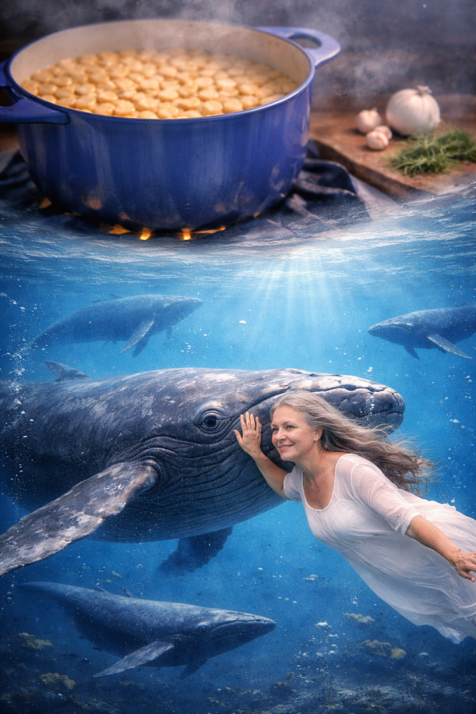 And then, just before my final wake-up, that whale found me. The one from the colonoscopy. He rose up beside me. I don’t know why I assume it’s a male, but I do. He leaned in and started whispering again, sharing the meaning of human life.
