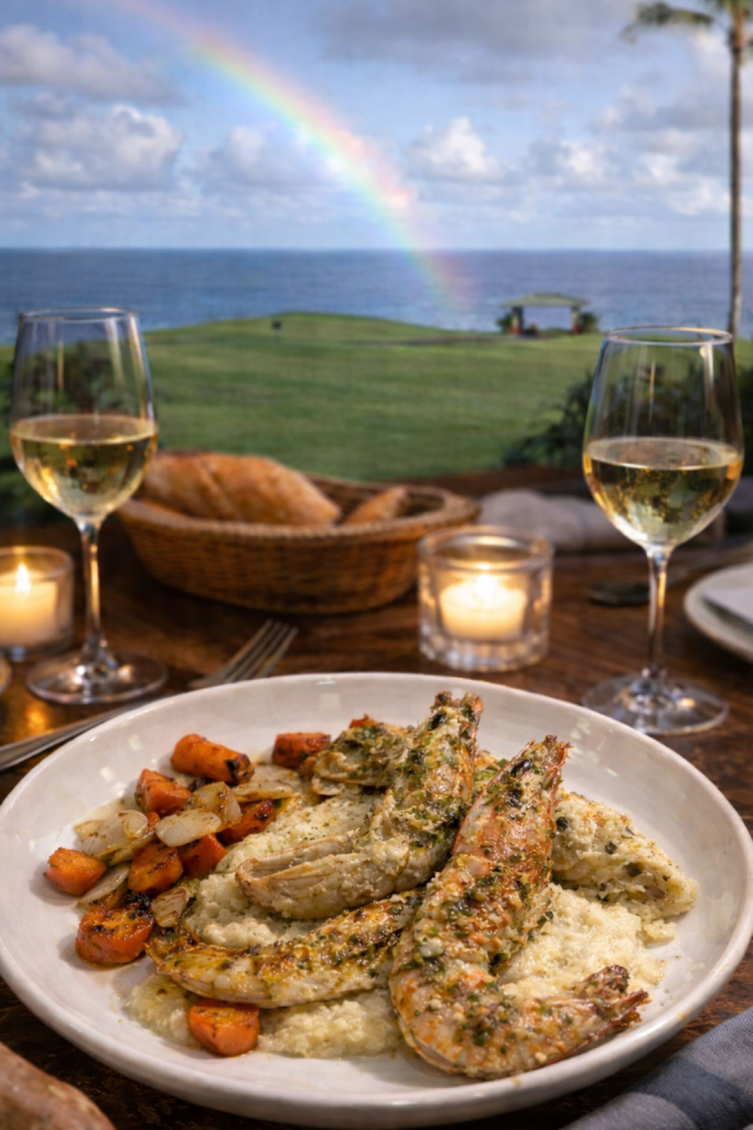 This is my favorite meal to prepare on Kauai. Once the marinades are prepared, everything else is easy. The shrimp grill quickly, the grits or polenta simmer quietly, and dinner comes together without effort. It is the kind of cooking that fits naturally into island evenings, when the light softens, the trade winds settle, and time stretches just enough to let you breathe.