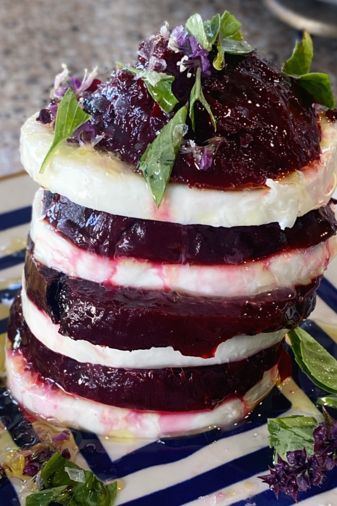 - To assemble, alternate layers of beet slices and fresh mozzarella, stacking as high or as casually as you like.